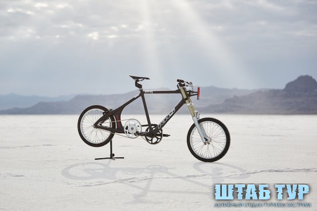 У Денис велосипед был сделан из легкого карбона и оснащён особыми колесами, похожими на мотоциклетные: они обеспечивают устойчивость и позволяют проезжать до 40 метров за одно нажатие педали.