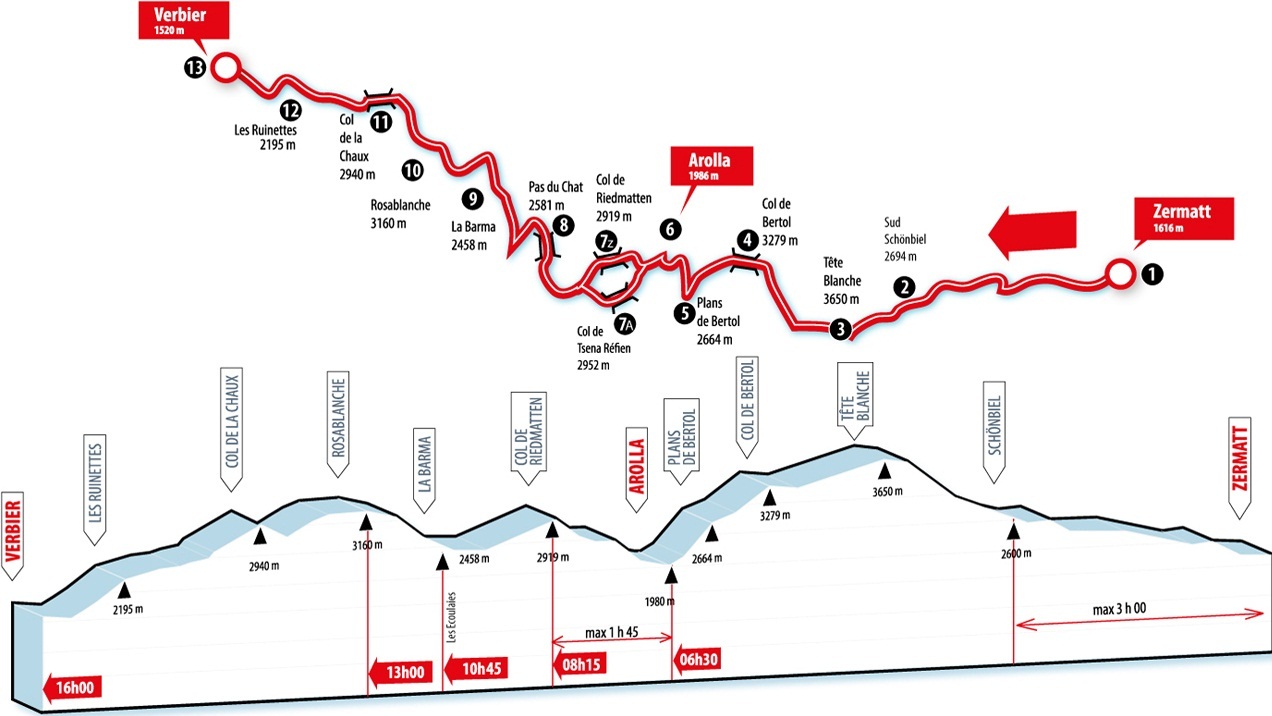 Как и у любой гонки, у Patrouille des Glaciers есть лимит времени нужно пройти, уложившись в 8:30. Первые победители финишировали в 1943-м за 13 часов. Рекорд трассы — 5 часов 52 минуты