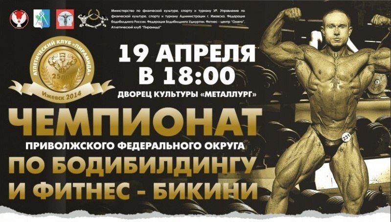 19 апреля 2014 года в ДК "Металлург",Федерация проводит Традиционный Открытый Чемпионат Приволжского Федерального округа по бодибилдингу и бодифитнесу – «Ижевск 2014». В соревнованиях примут участие сильнейшие спортсмены из Кировской, Нижегородской, Самарской , Ульяновской областей, Удмуртской, Чувашской, Башкирской Республик ,Татарстана. Пятый раз в рамках Чемпионата , пройдет Конкурс «Мисс бикини» фитнес –модель . билеты можно преобрести на сайте: hochubillet.net или в кассе ДК "МЕТАЛЛУРГ"