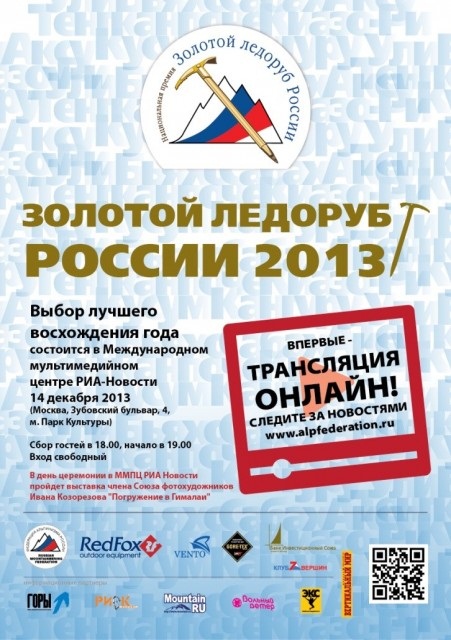 14 . 12. 2013 в Москве состоится вручение национальной премии Золотой Ледоруб России – самой престижной награды, которая вручается за лучшее альпинистское восхождение года. Премия была учреждена Федерацией альпинизма России, при содействии компании Red Fox, и в этом году будет вручаться уже в седьмой раз