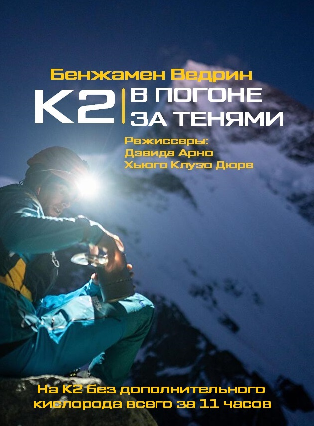 Режиссеры: Дэвида Арно и Хьюго Клузо Дюре. Фильм «В погоне за тенью» рассказывает о захватывающем восхождении Бенжамена Ведрина на К2. После первой попытки, когда трагедии едва удалось избежать, Ведрин полон решимости совершить невероятный подвиг: подняться на вторую по высоте гору в мире за один день без дополнительного кислорода и спуститься на параплане.