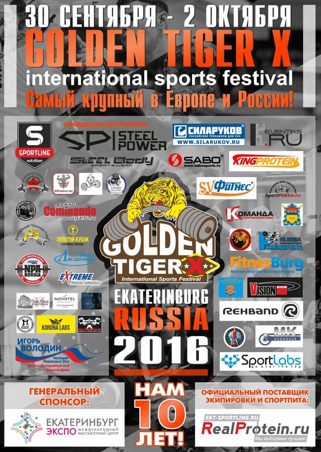Дата: 30 сентября по 2 октября 2016 г. Место: Екатеринбург ЭКСПО. Участников: 6 тысяч спортсменов "Золотой Тигр — X" 2016 г. в рамках подготовки к юбилею, появилась возможность увеличить размеры выставки сразу до трёх павильонов из четырёх существующих, увеличив тем самым крытые выставочные площади ТИГРА почти вдвое, до 40 тыс.квадратных метров, более 15 тысяч зрителей.