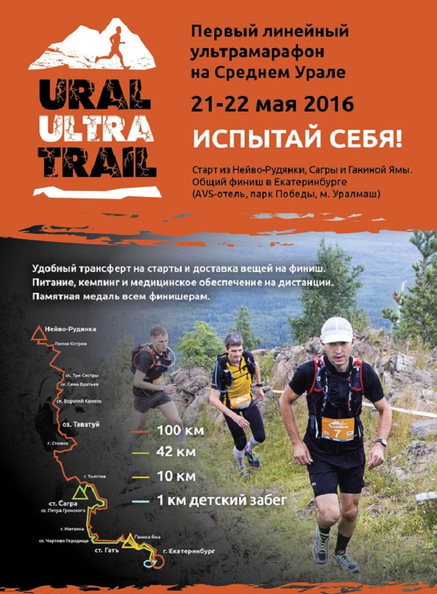 Место: Екатеринбург. Дата:22 мая 2.016 г Форма: Линейно трейлоговый. URAL ULTRA TRAIL – длина 100км, общий набор высоты 2500м, контрольное время прохождения дистанции 24 часа, старт из пос. Верх-Нейвинск. URAL TRAIL MARATHON – длина 42км, общий набор высоты 1300 м, контрольное врем я 8 часов, старт из пос.Сагра. URAL TRAIL RACE – длина дистанции 10км, набор высоты около 100м, контрольное время 2 часа, старт с территории монастыря Ганина.