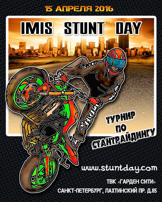 Место: Россия, Санкт-Петербург, Лахтинский пр. д. 85 , ТВК "Гарден Сити". Дата: 15 апреля 2016 год Открытый турнир по стантрайдингу IMIS STUNT DAY 2016 пройдет в рамках седьмого международного мотосалона IMIS