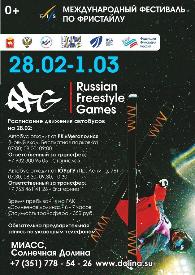 С 26 февраля по 1 марта 2015 в ГЦ «Солнечная долина» г. Миасс, Челябинской обл. при поддержке Министерства спорта России, Ассоциации лыжных видов спорта России, Федерации фристайла России, Национальной горнолыжной лиги пройдёт первый фестиваль по фристайлу. Для зрителей будет создана фан-зона, вмещающая несколько тысяч человек. С огромного экрана гости «Солнечной долины» смогут наблюдать за всеми событиями, которые будут происходить на трассах