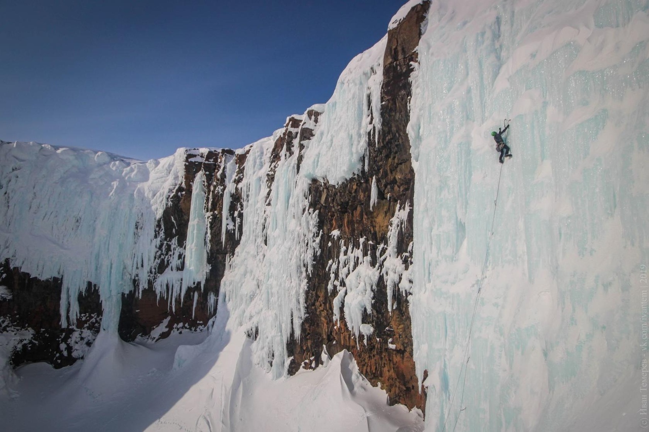 После спуска альпинистов с верхней страховкой попробовали лед Влад Голуб и Темерев Иван. Ледовая структура сильно отличается от привычного многим ледолазам рельефа – на вертикальном льда часто держится снег, который сильно мешает продвижению вперед и осуществлению страховки. Помимо этого поверх снега регулярно намерзает новый лед, что создает большое количество ледовых пустот и ледовой корки.