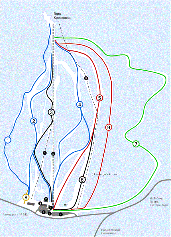 1. "Лесная" протяженность 1310 метров, перепад высот 310 м.2. "Гигант" - протяженность 1320 м, перепад высот 310 м3. "Скоростной спуск» - протяженность 1270 м, перепад высот 310 м4. "Турист" - протяженность 1525 м, перепад высот 310 м5. "Слалом" - протяженность 1557 м, перепад высот 310 м6. "Чегет" - протяженность 533 м, перепад высот 165 м7. "Сюрприз" протяженность 2600 м., перепад высот 310 м8. "Учебная" протяженность 80м., перепад высот незначительныйСклон горы обслуживает 5 подъемников. Отдыхающие могут расположиться в гостинице на территории горнолыжного центра, или воспользоваться гостиницами близлежащих городов. Также на территории комплекса имеется автомобильная стоянка.Начинающие могут воспользоваться услугами опытных инструкторов, взять напрокат необходимое горнолыжное снаряжение.Горнолыжный центр Губаха одно из излюбленных мест отдыха туристов из всех уголков России, ближнего и дальнего зарубежья. Сюда приезжают как новички, так и опытные горнолыжники. Для всех имеется соответственный уровень трасс. Помимо традиционных горных лыж и сноуборда, здесь есть трасса для равнинных лыж, несколько спортивных клубов. Летом - рафтинг по Усьве. На этой горной реке более двухсот перекатов. В районе Губахи находится 25 пещер. Есть где развернуться и спелеологам.