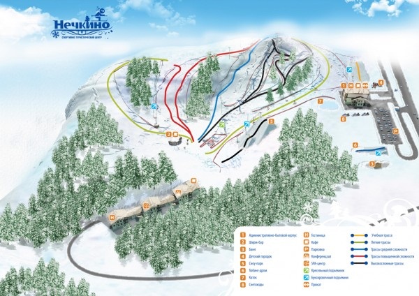 Зимой Спортивно-Туристический Центр “Нечкино” это современный горнолыжный комплекс, располагающий 10-ю трассами различной степени сложности с перепадом высот до 115 метров, самая длинная из которых – более 1,2 км, оборудованный самыми современными подъемниками, в том числе кресельным четырехместным подъемником «Doppelmayr».