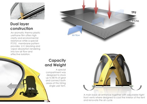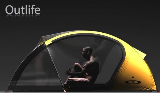 Модель палатки Outlife разработали чилийские дизайнеры: Alvaro Poblete Poulsen и Florencia Campos Correa. Прозрачная часть палатки Outlife имеет частично дышащую поверхность, но не пропускает капли воды. Материал полиуретан предоставит жильцу изоляцию и устойчивость от -20 ° C и до +60 ° C. Двойной слой ткани палатки, который непрозрачный, поможет избежать образование конденсата, а прозрачный не помешает обзору.