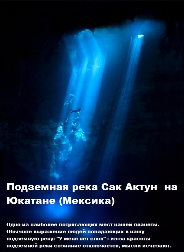 Подземная река Сак Актун на Юкатане (Мексика) в лабиринте подземных пещер джунглей штата Кинтана-Роо, что на полуострове Юкатан, Мексика, протекает самая длинная из всех известных сегодня подземных рек. По совместительству она носит статус самой впечатляющей мексиканской достопримечательности, которая поражает своими дивными геологическими образованиями. Изгибы и повороты водного потока по известняковым пещерам простираются на 215 км.