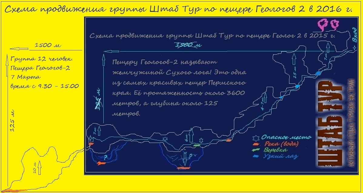 Группа набирается не более 12 человек. Пещера Геологов-2 находится в Гремячинском районе Пермской области, в трёх километрах от посёлка Юбилейный.
