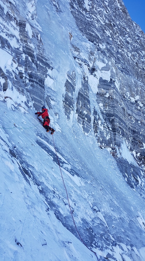 "На данный момент провесили 12 веревок. 11-я и 12-я веревки - лед, 85°-90°. Основная проблема в том, что не можем установить палатку - нет площадок. На обработку приходится выходить с 1-го лагеря. В БЛ по утрам -25? , -27? . Все ок!"