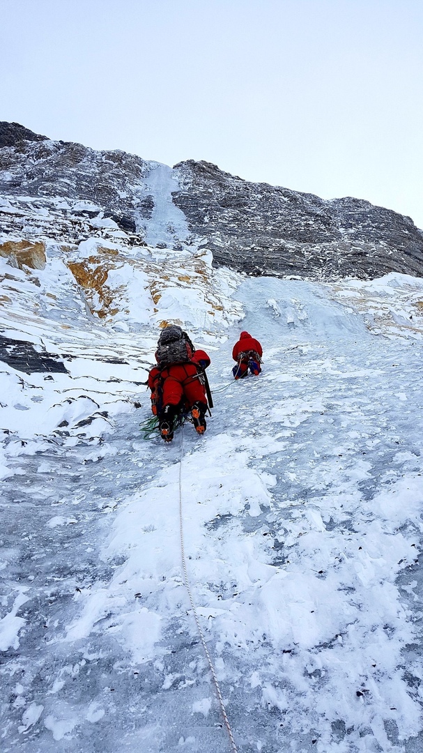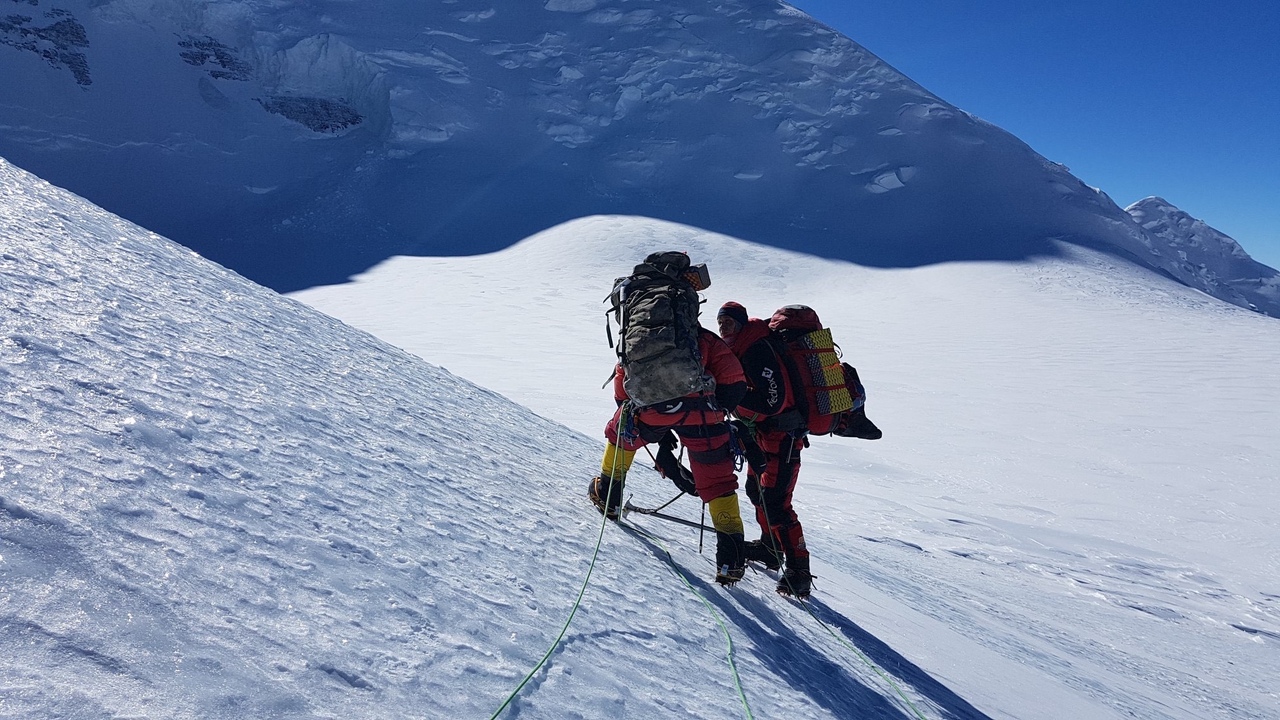 - Мы сами выбрали технически сложную стену. На словах сложно объяснить, что там происходит, как себя чувствует человек - некоторые участки вообще отвесные. И горовосходитель должен обладать для этого сильными альпинистскими навыками. Представьте: холод, вы в варежках, в большой пуховой одежде, должны и сами не упасть, и большие грузы поднимать вверх. Путь прокладывали, как будто дом строили. Закрепился и потом тянешь по частям, в среднем 100 кг, - рассказывает Михаил Даничкин.