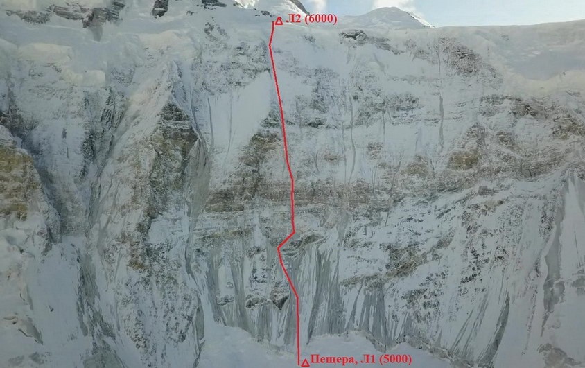 "Вырыли пещеру под начало маршрута (4950 м.). Перенесли туда 1-ый лагерь. Провесили еще 3 веревки."