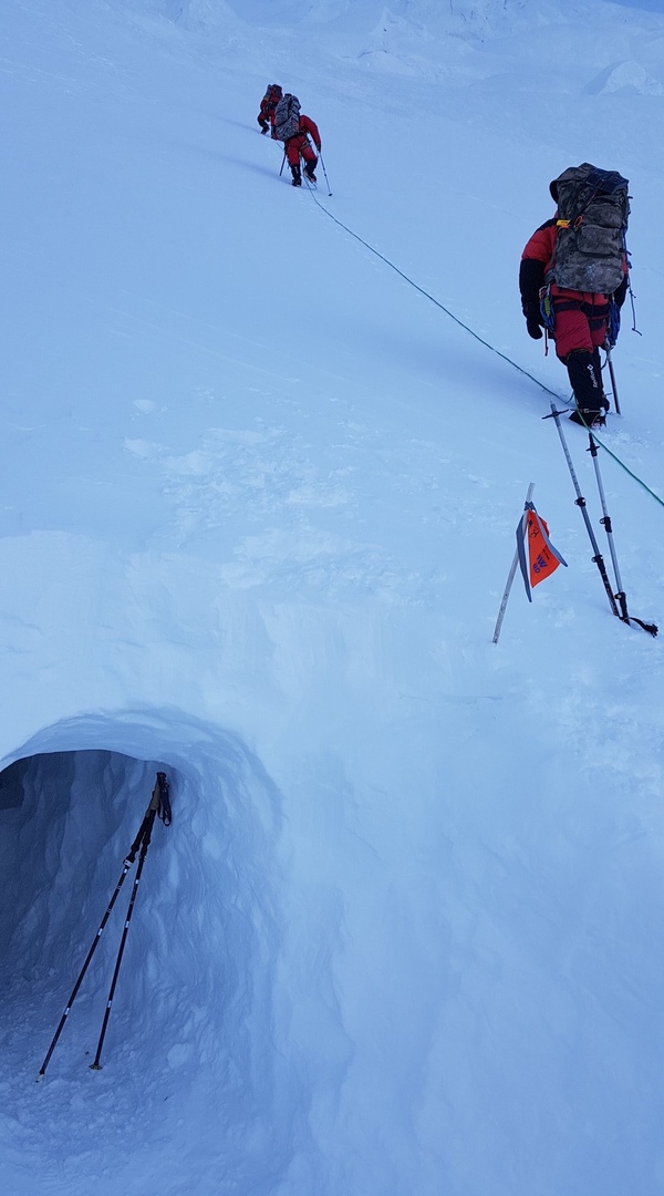 "Все группы спустились вниз, в базовый лагерь, отдохнули. Одна группа сегодня ушла наверх. Провешено 27 веревок. До "крыши" (плато) осталось 2 веревки. Все нормально!"