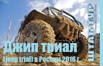 Джип триал (jeep trial) в России 2016 г.– соревнование пройдут в Удмуртии, г. Луганск, г. Александровск, республика Тыва, г. Смоленск, г. Саратов, г. Омск, республика Чувашия, Владимирская обл. Пермский край, Ярославская обл. Тамбовская обл. Брянская обл. Орловская обл. и т.д. Основным фактором джип-триала является безошибочное преодоление препятствий, обозначенных расположенными на трассе курсовыми воротами за минимальное время, не превышающее отведенный лимит времени.