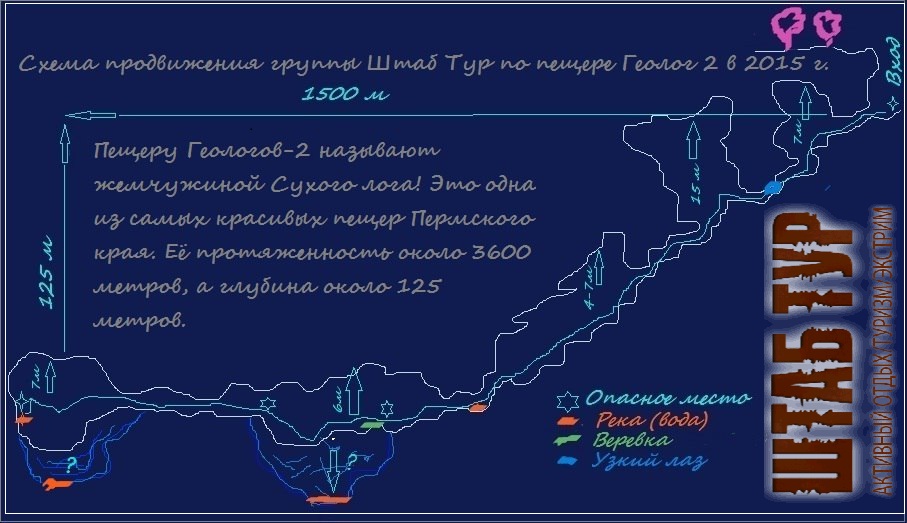 Группа набирается не более 12 человек. Пещера Геологов-2 находится в Гремячинском районе Пермской области, в трёх километрах от посёлка Юбилейный.