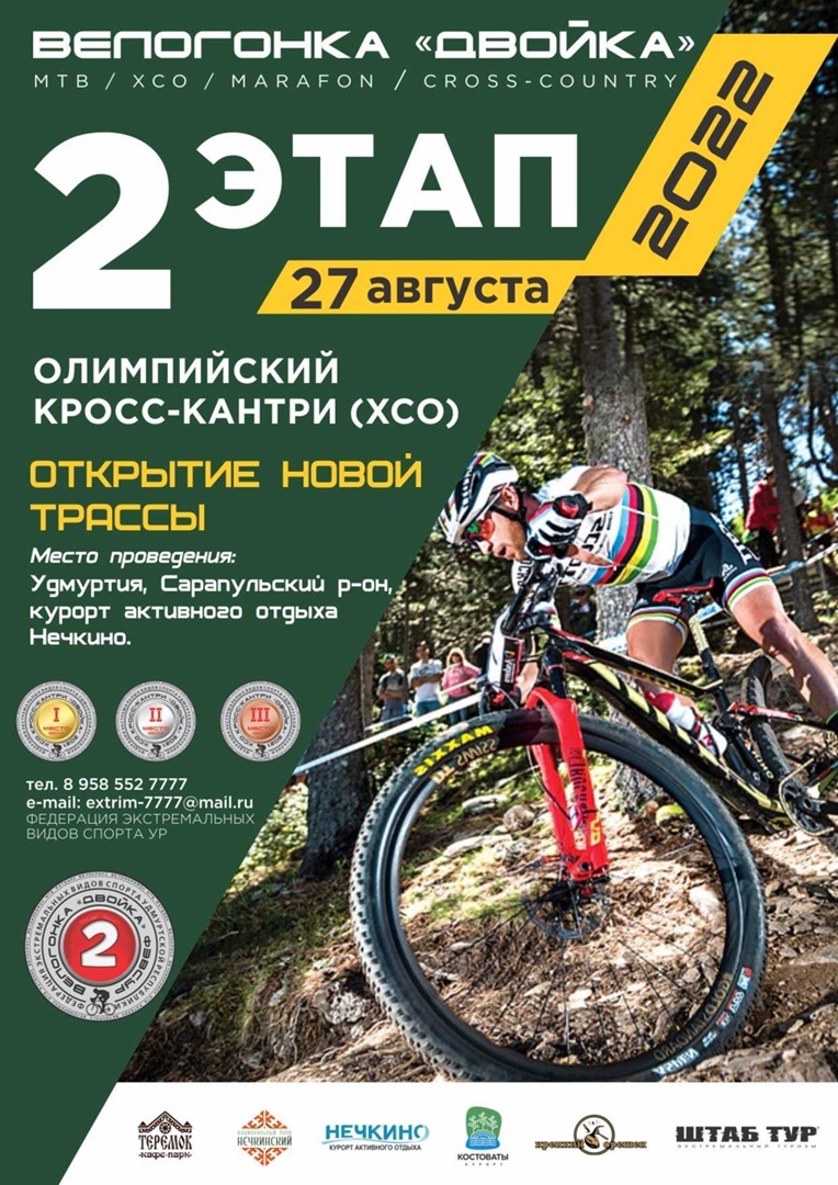 Открытие новой трассы с кругом 4 километра Дата проведения: 27 августа (суббота) 2022 года. Место: Удмуртия Сарапульский р-он, курорт активного отдых Нечкино. Дисциплина: - Олимпийский кросс-кантри (XCO)