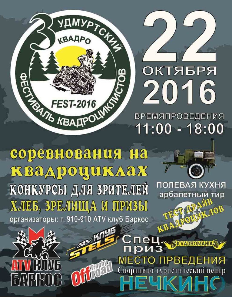 Место: Удмуртия СТЦ "Нечкино " Дата: 22 октября 2016 год К участию в соревнованиях допускаются любители езды по бездорожью, достигшие восемнадцатилетнего возраста и обладающие правом управления транспортным средством.