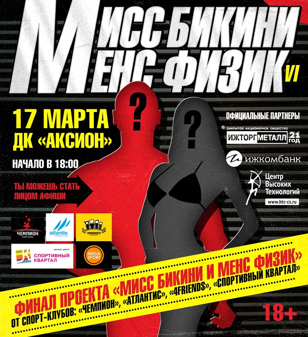 Дата: 17 марта в ДК «Аксион» финал проекта «Мисс бикини и Менс физик» Место: г. Ижевск ДК «Аксион» «Мисс бикини и Менс физик» 2016 г оргонизаторы спорт-клубов «Чемпион», «Атлантис», «4Friends», «Спортивный квартал»
