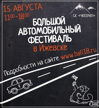 Место:г.Ижевск СК «Чекерил» Время:15 августа с 11 00 по 18 00 час. Авто-гонки и мото-шоу. Показательные заезды на демонстрационных автомобилях премиум-класса Внедорожные тест-драйвы
