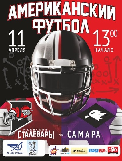 11 апреля в г. Сарапул на стадионе "Сокол" ул. Молодежная д. 8 состоится товарищеский матч по американскому футболу между командами "Ижевские сталевары" и "Самара". Начало в 13:00.
