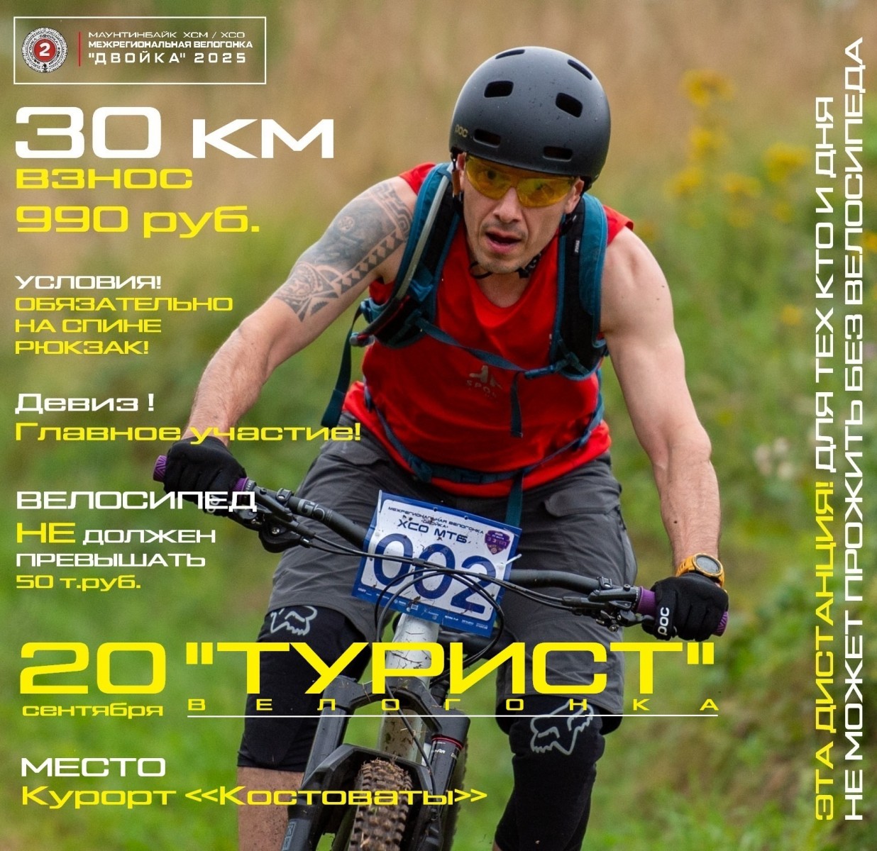 Дата: 20 сентября. Дистанция:30 км.(1 круг) Регистрация доступна до 10 сентября 2025 г. Вступительный взнос 990 руб. Возраст: не ограничен Гонка в рамках 4-го этапа "Двойка"2025.
