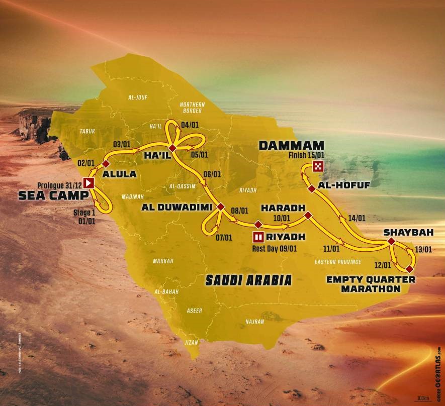 Гонка пройдёт с 31 декабря 2022 года, когда состоится пролог, по 15 января 2023 года, когда караван участников, сумевших справиться со всеми вызовами, прибудет на торжественную церемонию финиша. Маршрут марафона проложен от «Морского лагеря» недалеко от Янбу, на берегу Красного моря, до Даммама на берегу Персидского залива.
