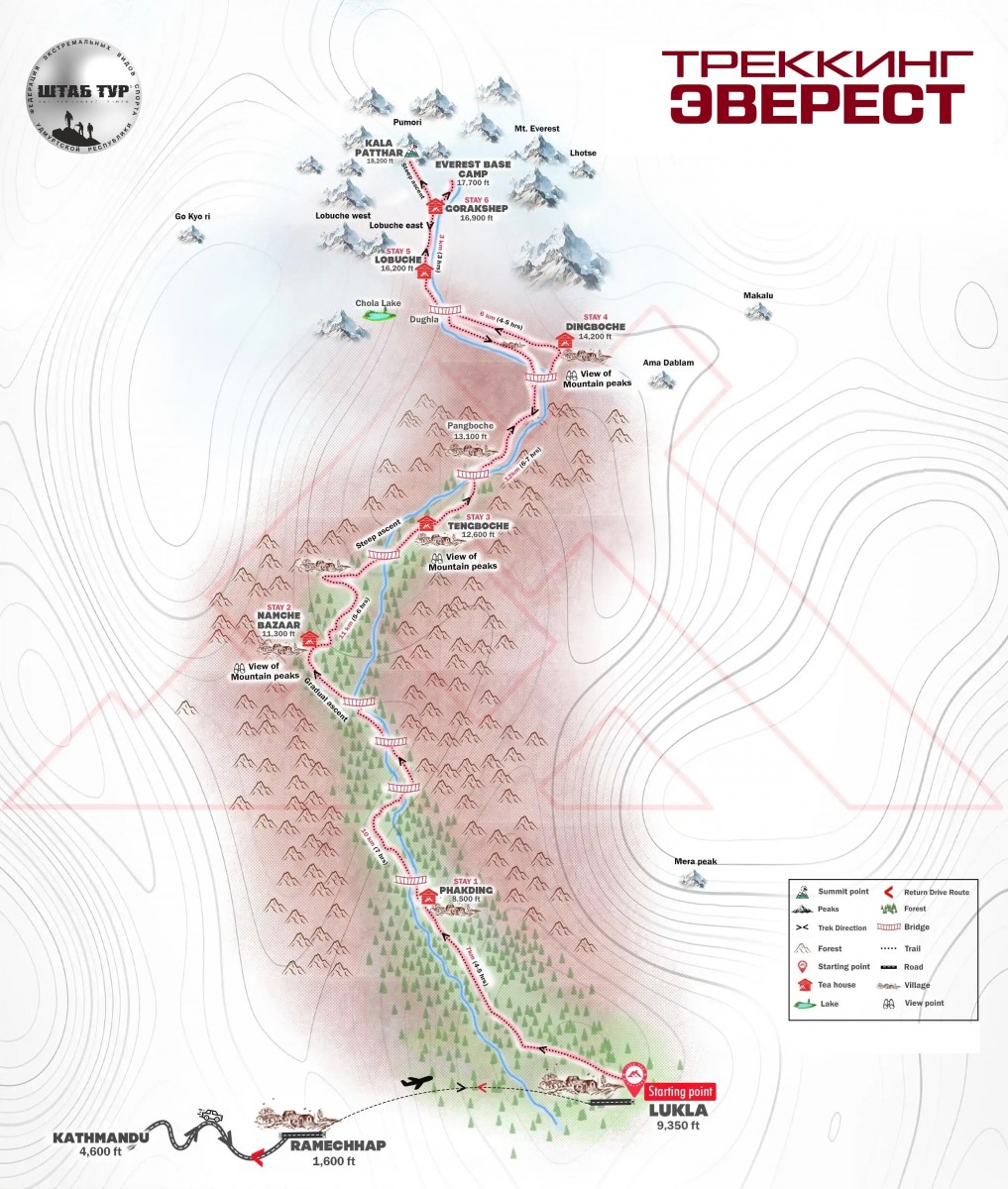 Далее: В обратный путь на усмотрение группы, можно остаться на отдых и прогуляться на вершину Кала Патхар (5644 м) есть возможность обратно в Катманду на вертолете.