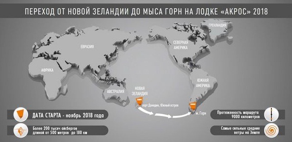 Фёдор Конюхов намерен стартовать из новозеландского порта Dunedin, расположенном восточном побережье Южного острова в ноябре 2018 года. После старта лодка возьмет курс на восток, юго-восток, через Тихий океан к мысу Горн. Это будет самый протяженный этап кругосветного маршрута.