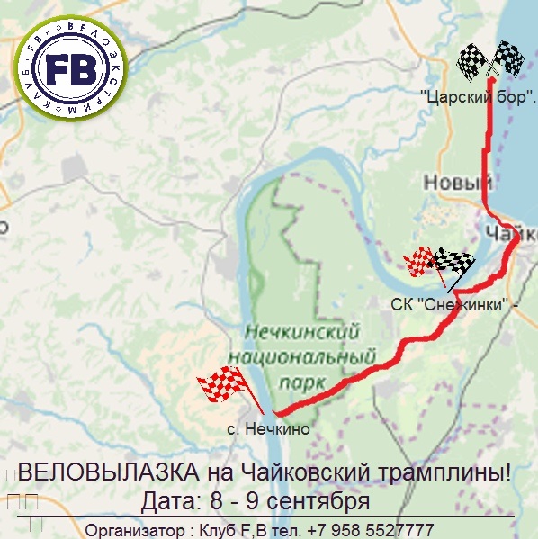 Маршрут:: с. Нечкино - переправа через р. Кама - велокросс через Нечкинский национальный парк до спорткомплекса "Снежинки" - спортивный комплекс "Снежинки Биатлон" - г. Чайковский - база Царский бор.
