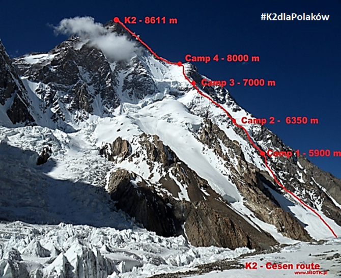 Поляки будут восходить по юго-восточному контрфорсу, по так называемому маршруту басков, или по линии Чесена (фото Марчин Мётк). Линия идёт по контрфорсу между линией Кукучка-Петровски и ребром Абруцци. На высоте около 8000 м, между так называемой Чёрной Пирамидой и Шейкой (Бутылочным горлом?), в районе расположения будущего лагеря IV контрфорс соединяется с Ребром Абруцци.