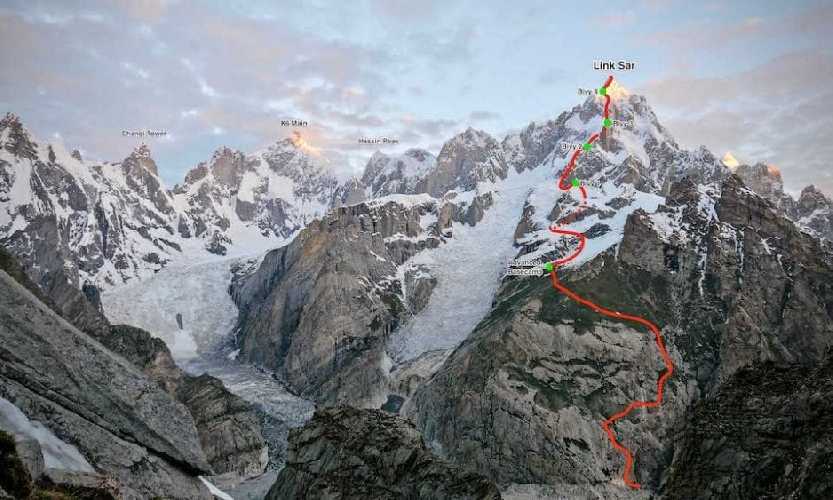 Маршрут: первое в истории восхождение на пакистанскую вершину Линк Сар (Link Sar) высотой 7041 метр, что расположена в долине Чаракуза (Пакистан). Маршрут проложен по Юго-Восточной стене. Категория линии: 2,300м, AI4 M6+ 90°